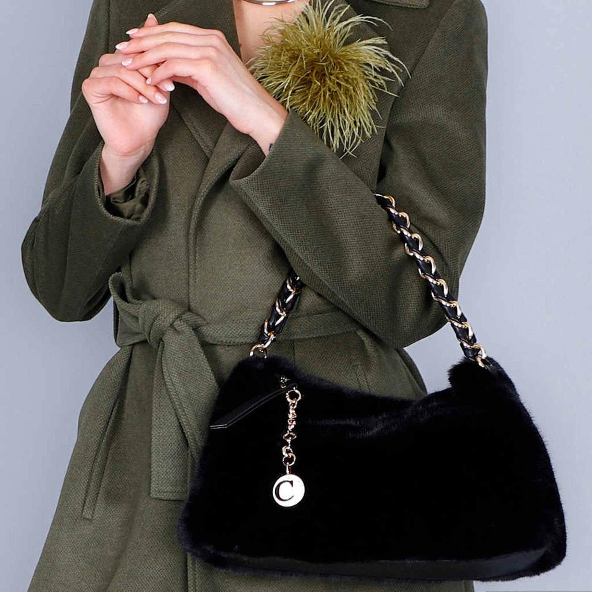 Borsa a spalla morbida in pelliccia sintetica con tracolla a catena infilata e charm in metallo con logo cafènoir. dotata di tracollina removibile per doppio stile.