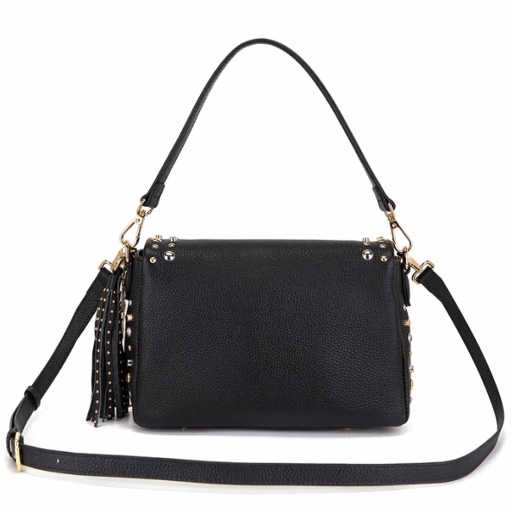 Borsa a spalla in pelle martellata con borchie in oro ed argento, manico e tracolla in pelle rimovibili