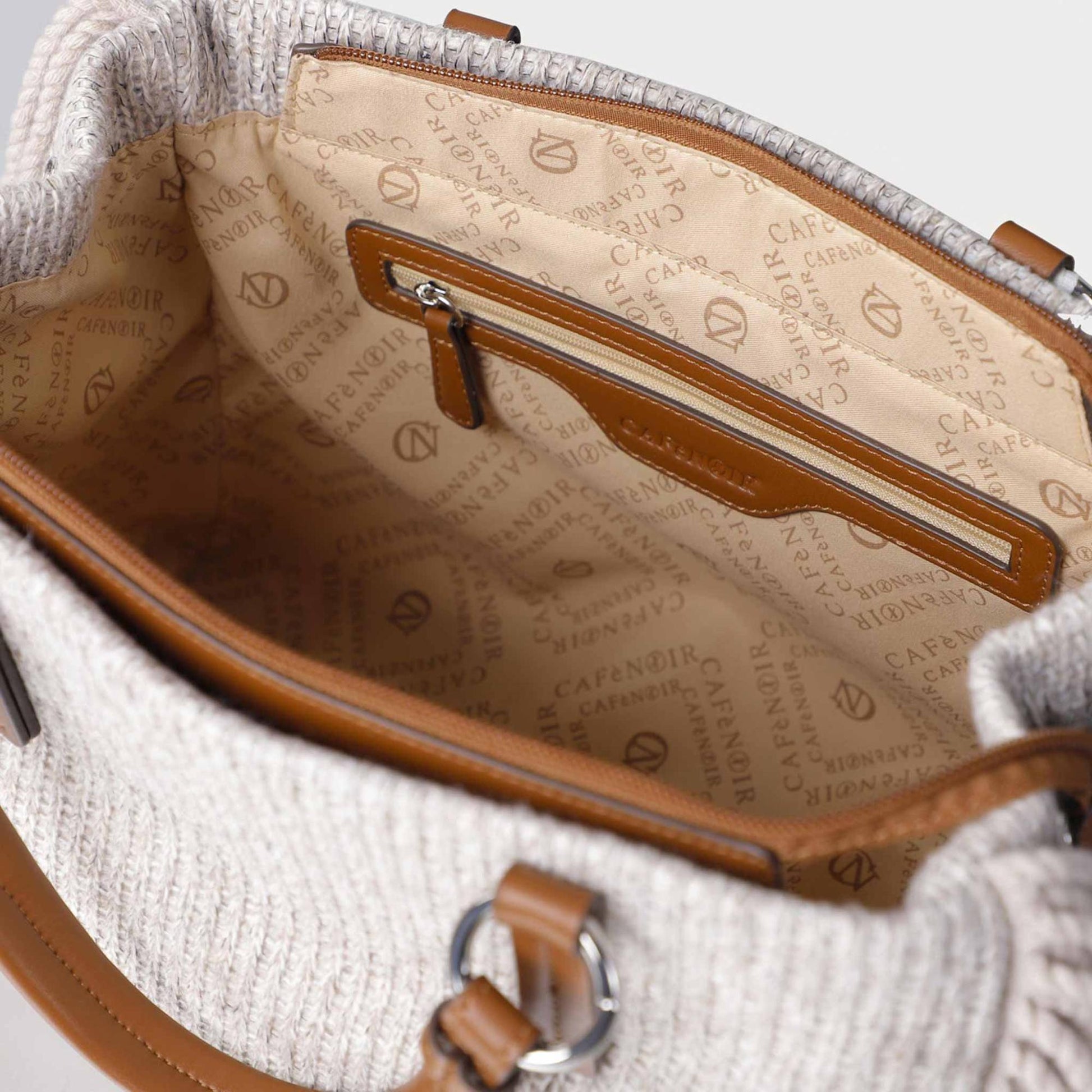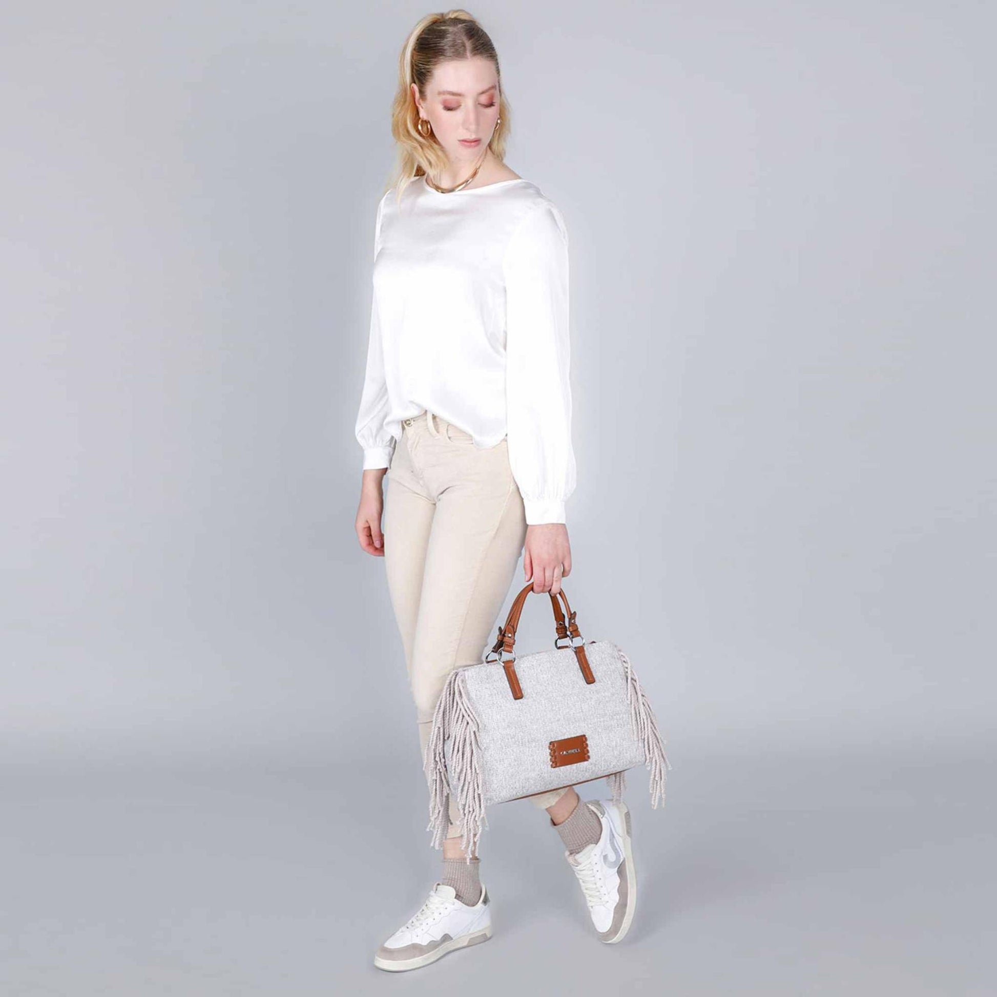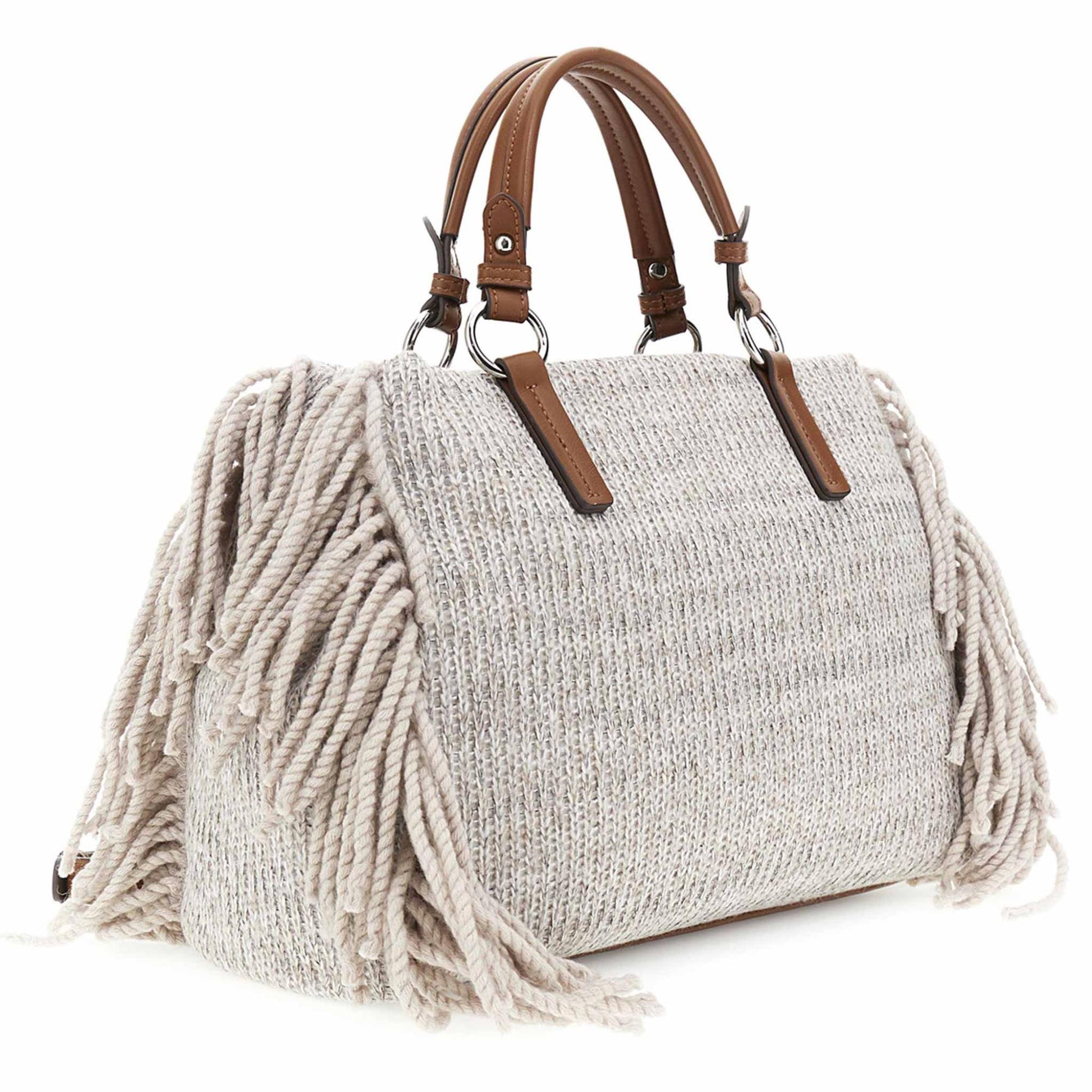 Borsa a mano in maglia effetto lana con frange laterali doppi manici e tracolla regolabile. dettagli in similpelle tag frontale con logo e bottoni decorativi sui fianchi.