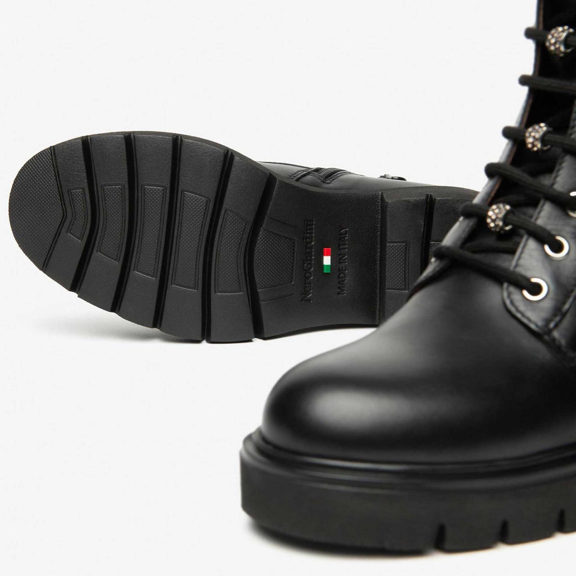 Anfibi NeroGiardini, personalità e stile unico. Le calzature NeroGiardini sono realizzate in Italia, utilizzando materiali di qualità e le più avanzate tecniche di lavorazione. Ogni scarpa è il risultato della esperta competenza artigiana tramandata di generazione in generazione. Tutti i modelli sono progettati per offrire comodità e versatilità in ogni momento della giornata, dal lavoro alla serata speciale. Il reparto stile NeroGiardini è costantemente alla ricerca di nuove tendenze per offrire calzature sempre attuali e originali. NeroGiardini propone anche una collezione di borse, perfettamente abbinabili alle calzature, per un total look Made in Italy impeccabile.La soletta in poliuretano DryGo!®, oltre alle capacità di assorbimento del sudore e di asciugatura rapida, che mantengono il piede asciutto in qualsiasi condizione climatica, offre anche l'innovativa funzione Memory ad elevato assorbimento degli urti, che si modella delicatamente al piede garantendo comfort e benessere. La produzione Made in Italy delle calzature NeroGiardini è sottolineata dal tricolore impresso sulle suole e sul packaging.