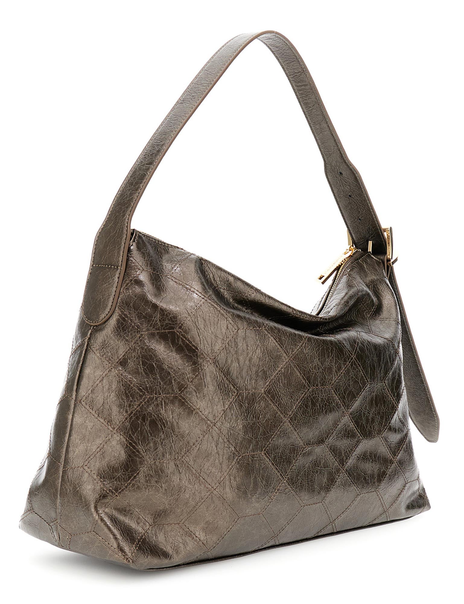 Sacca morbida in similpelle effetto pelle metallizzato con ricamo geometrico fronte/retro. manico regolabile con fibbia tracolla removibile e logo in metallo.
