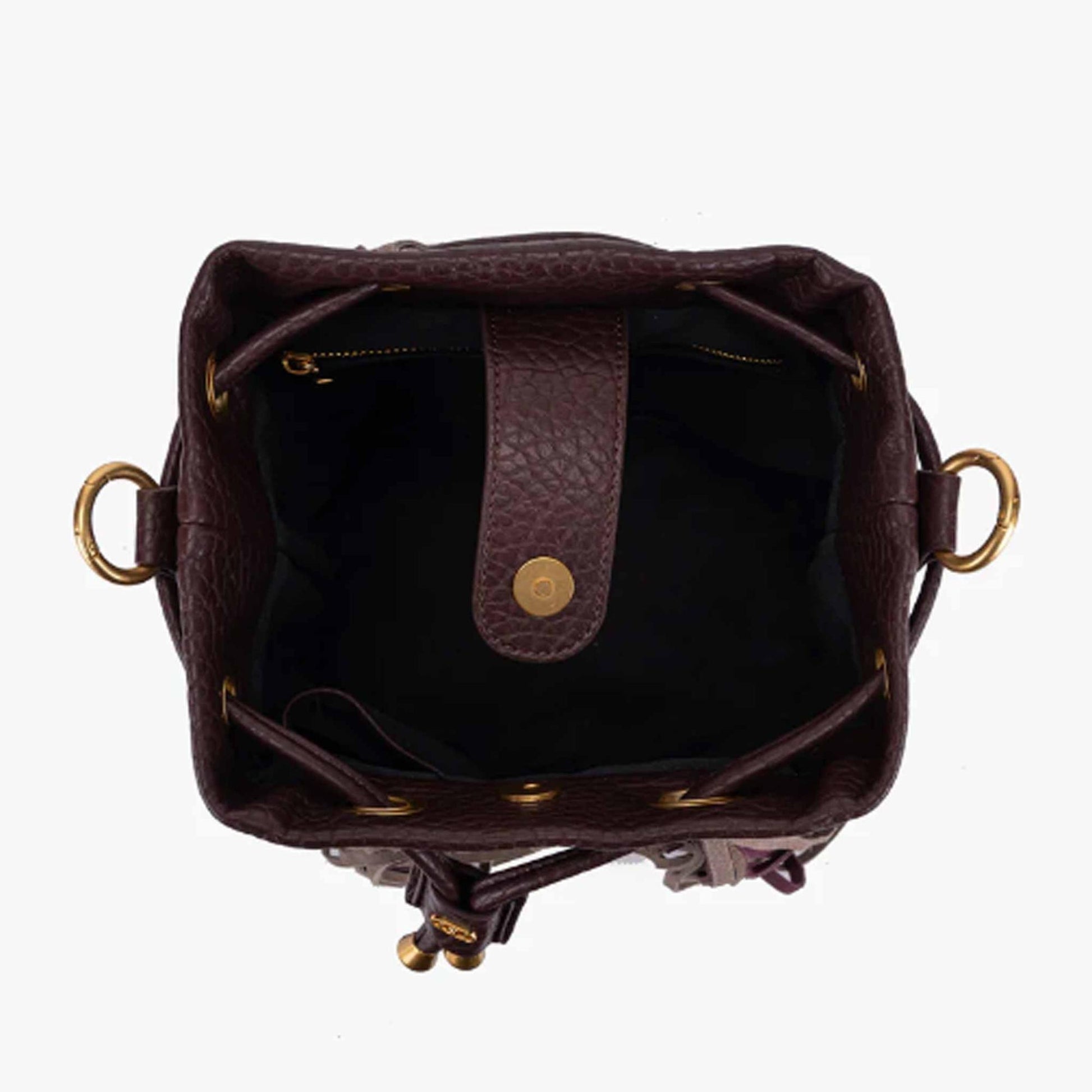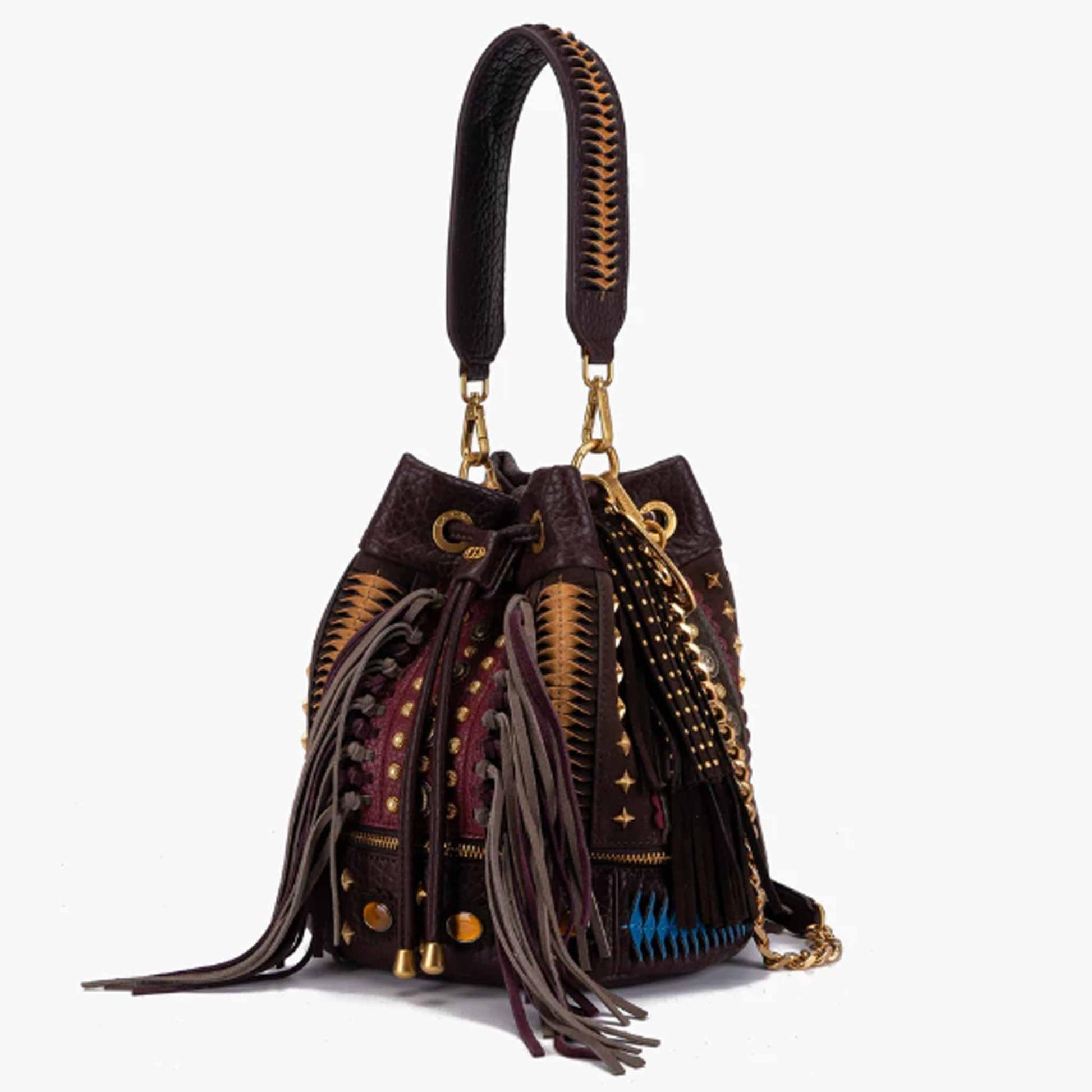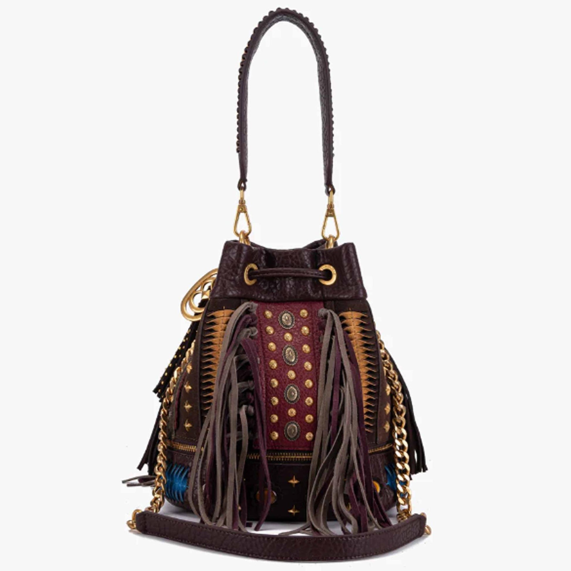 Secchiello in ecopelle effetto martellato con borchie in oro , tracolla catena e manico rimovibile