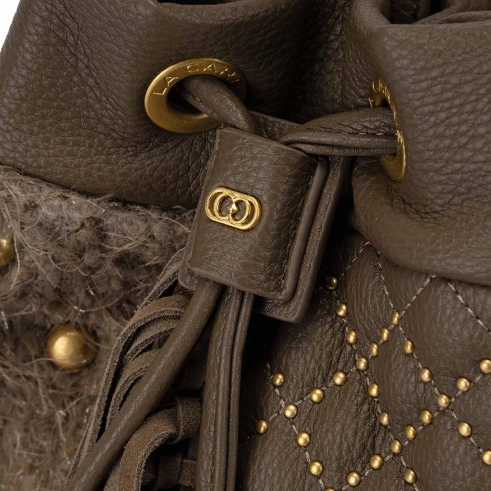 Secchiello multi materiale in ecopelle martellata e tessuto, con frange e borchie, manico e tracolla rimovibili