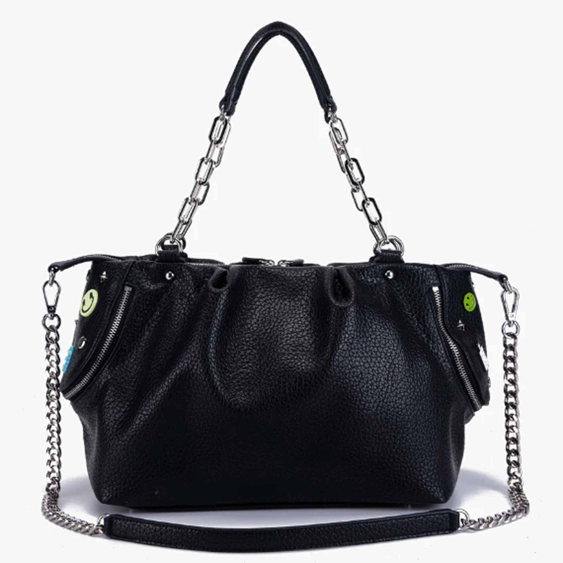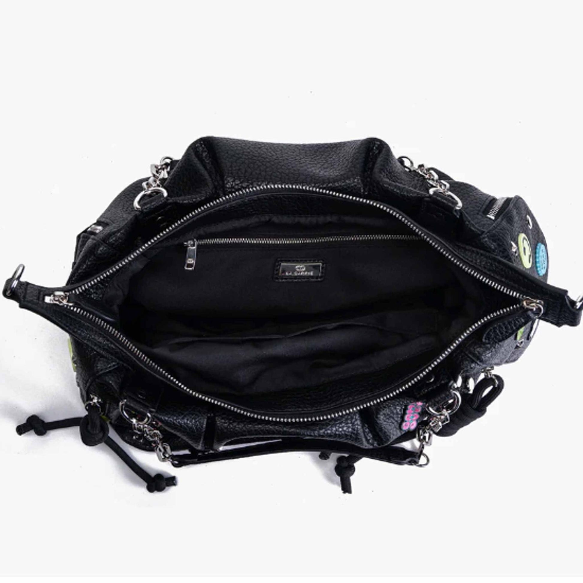 Borsa shopping con doppi manici in ecopelle martellata, con spille colorate applicate e chiusura a zip