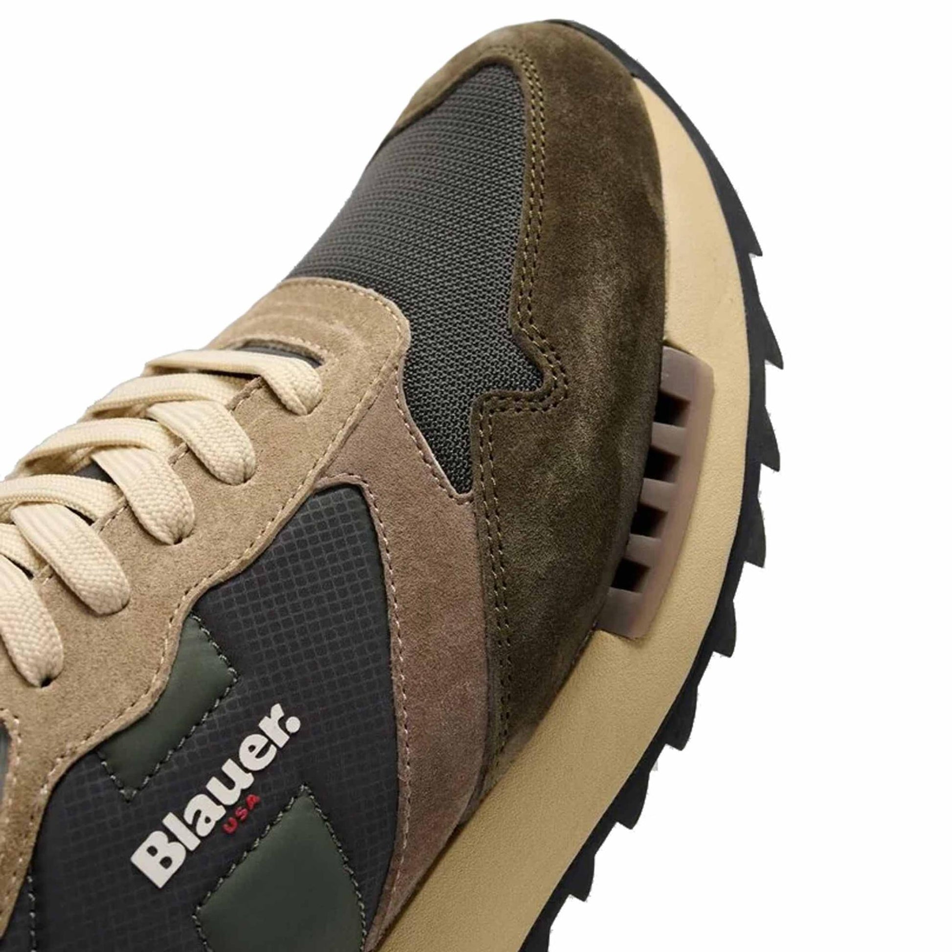 Sneakers RYDER dal design sportivo con un tocco vintage. La tomaia combina materiali diversi, con un effetto cromatico equilibrato, il logo Blauer è visibile lateralmente e sulla linguetta. La suola in eva con elementi a contrasto, è seghettata per un look dinamico. Il battistrada in gomma garantisce aderenza e durata. Ideali per un outfit casual e curato.