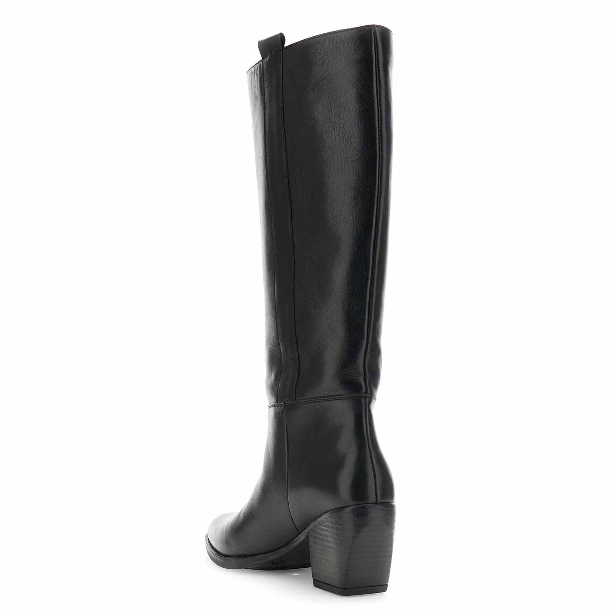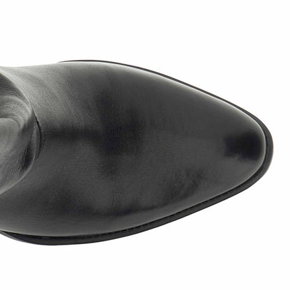 Stivali in pelle nera dal design essenziale ma deciso con dettagli tono su tono. fodera e soletto in pelle. tacco block 7 cm per un'eleganza disinvolta e contemporanea.