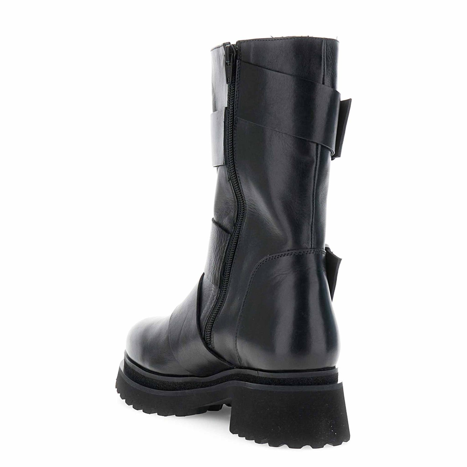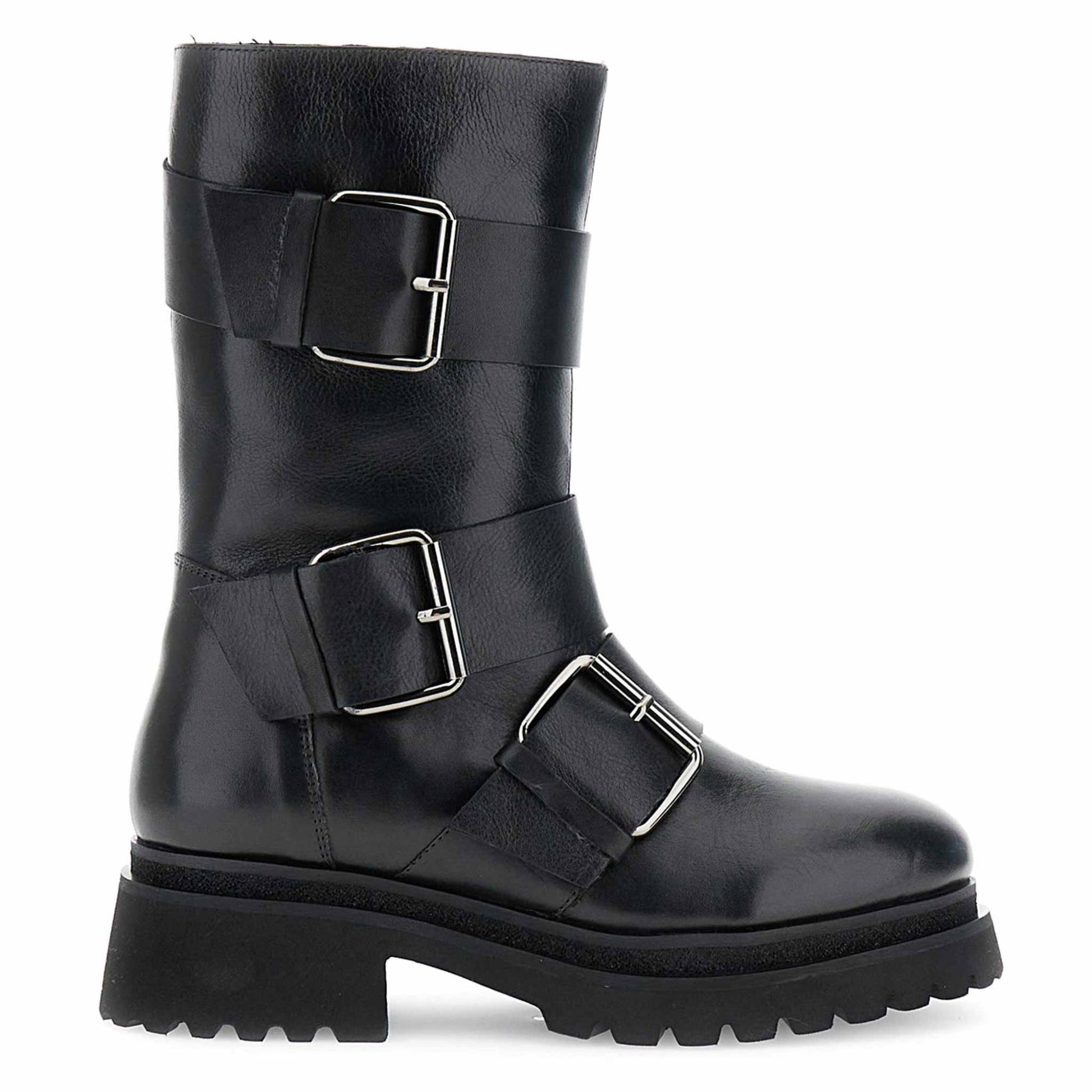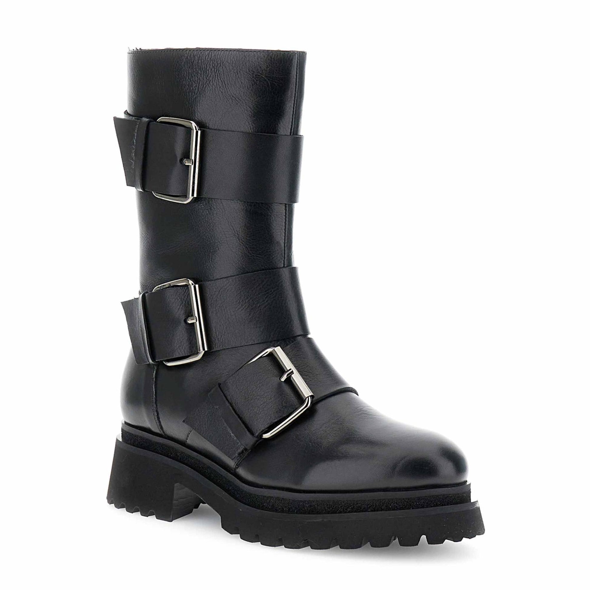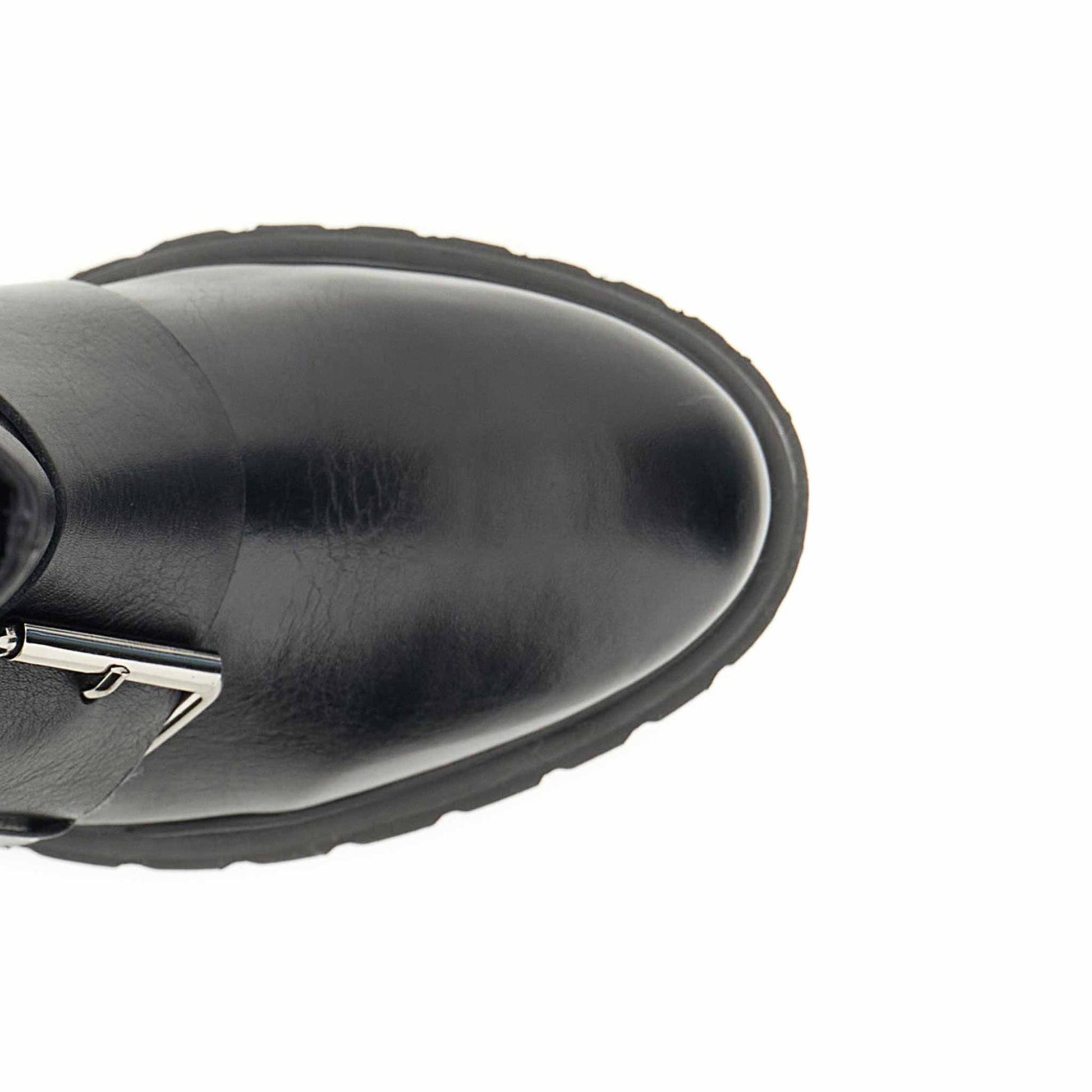 Tronchetti a tubo in pelle nera con maxi fibbie decorative. design grintoso e contemporaneo soletto in pelle e tacco da 55 cm. perfetti per look urban dal carattere deciso.