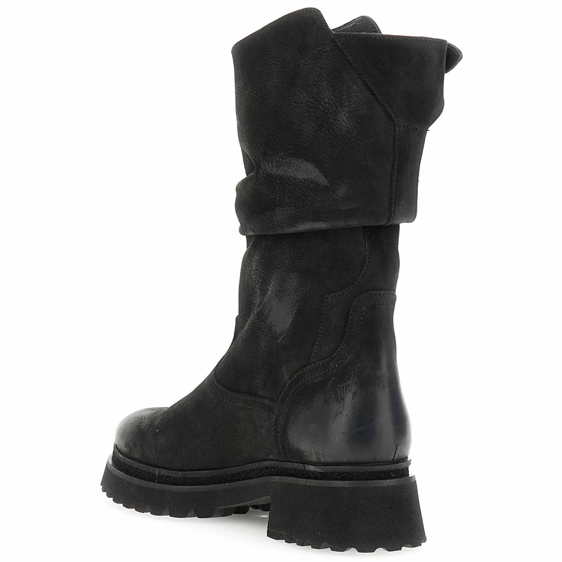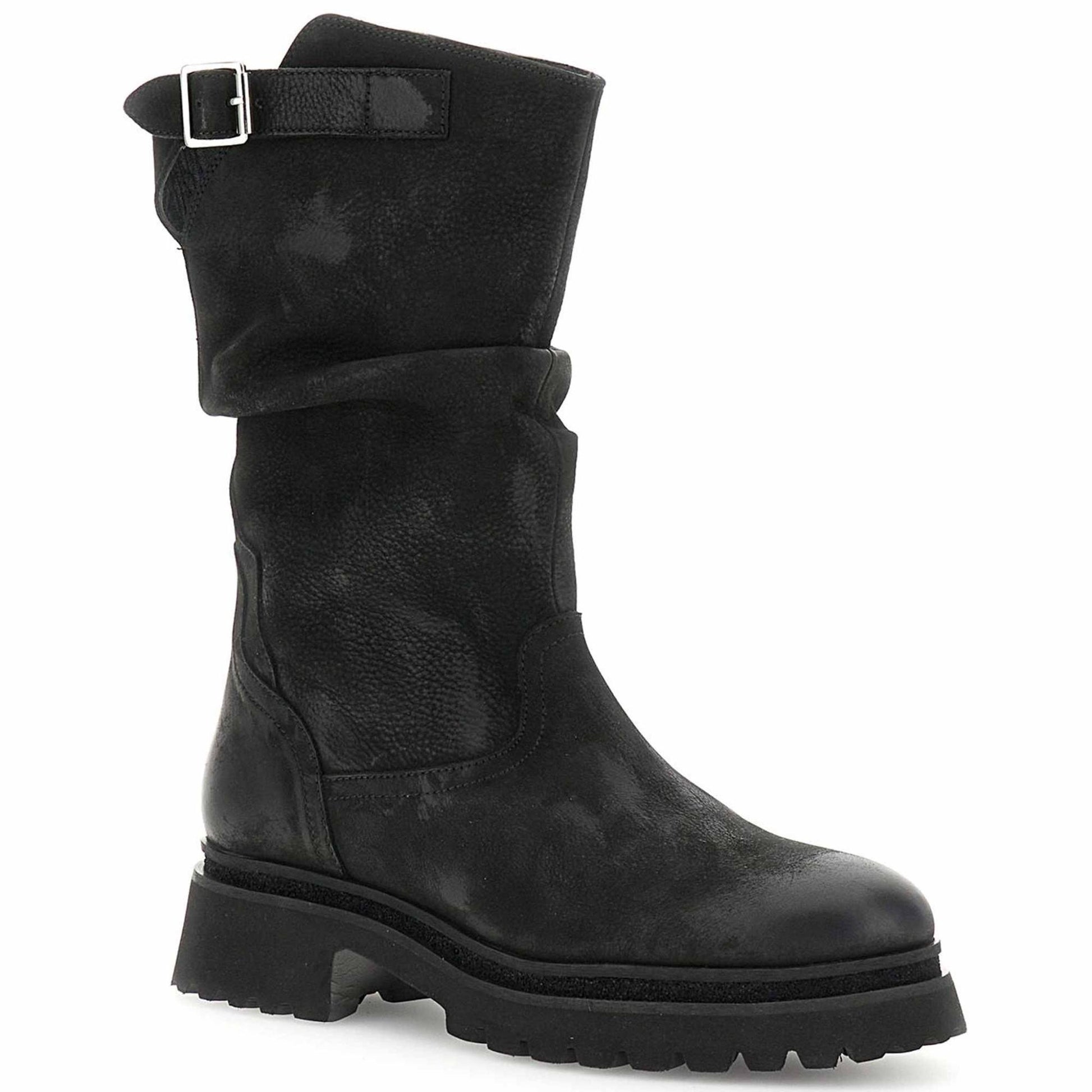 Tronchetti a tubo in nabuk con pieghe morbide e cinturino alla caviglia. soletto in pelle suola carrarmato e tacco da 55 cm. stile grintoso per look urban contemporaneo