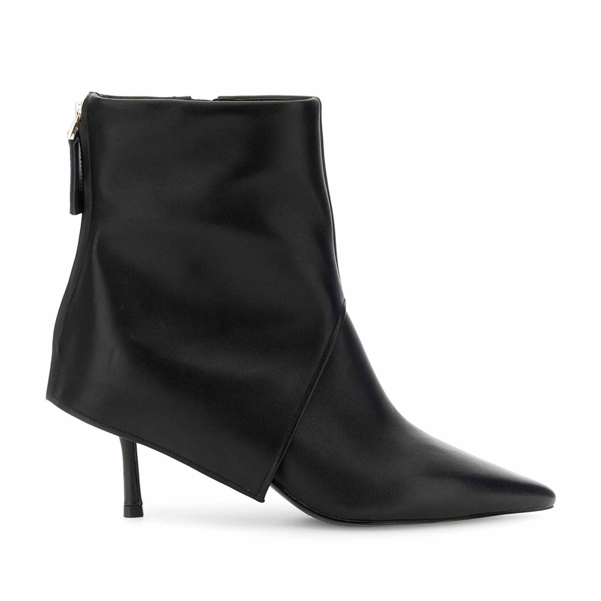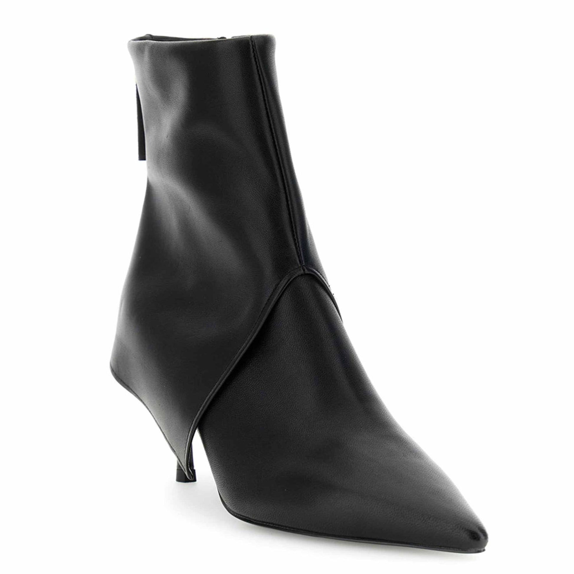 Avvolgono la caviglia con una piega sensuale i tronchetti in pelle con risvolt0 scolpiscono la silhouette con un tacco sottile da 75 cm e una forma sfilata dal fascino magnetico